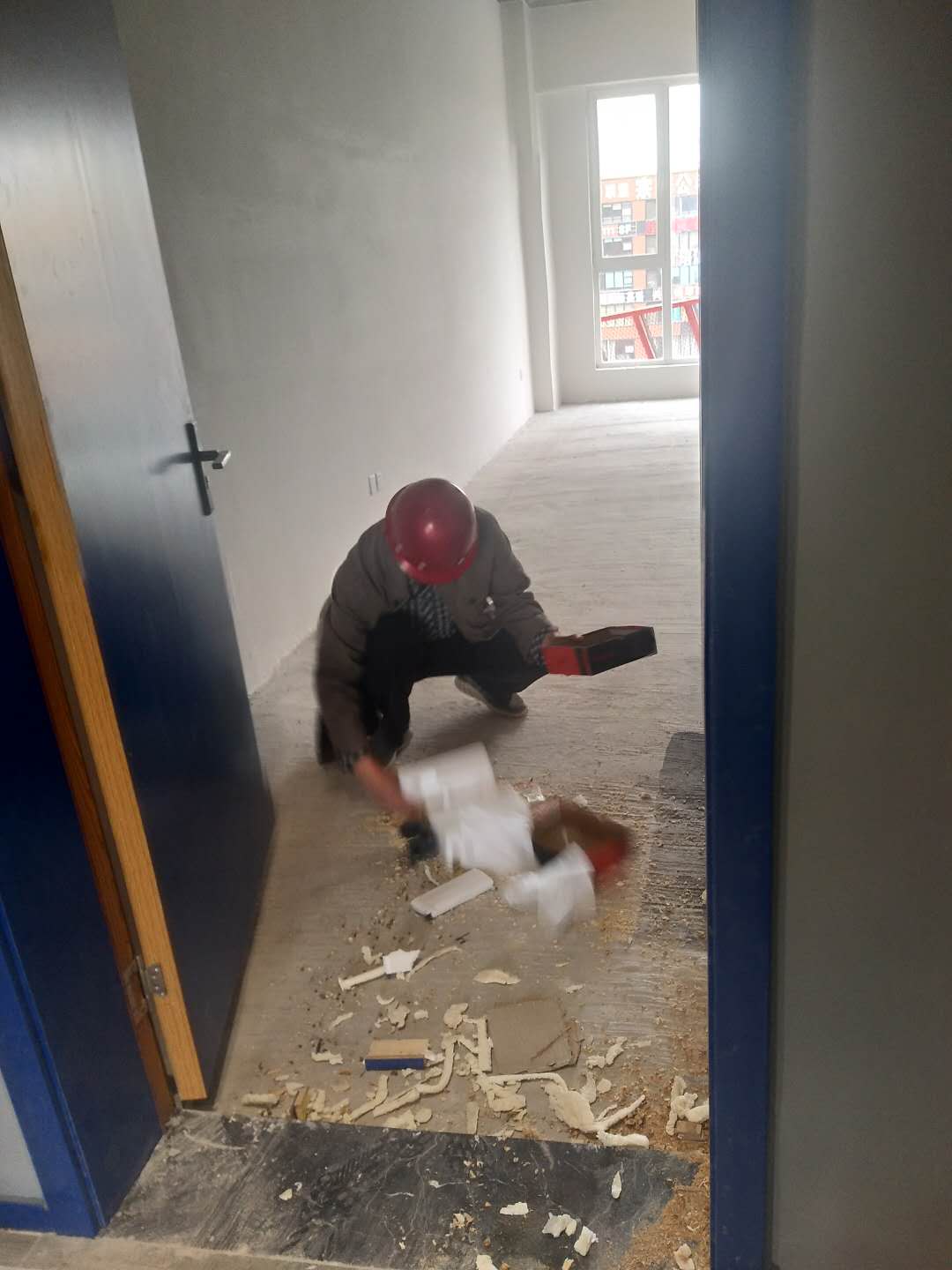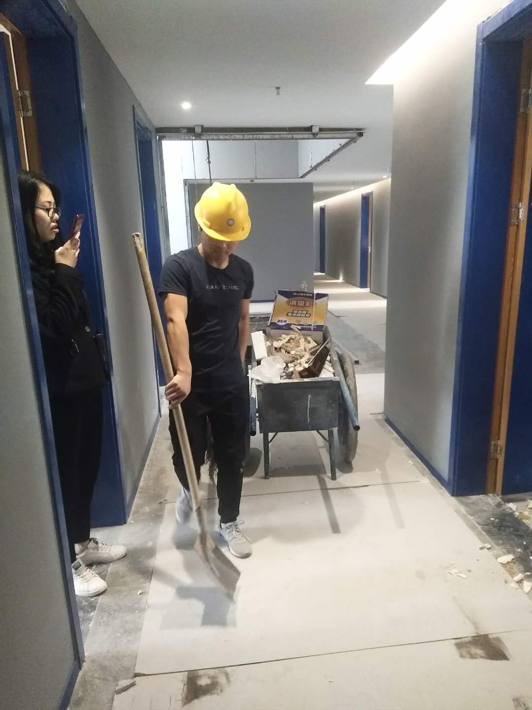 2018年5月6日工師傅們?cè)趯?shí)施***后一道工序打膠并打掃衛(wèi)生。