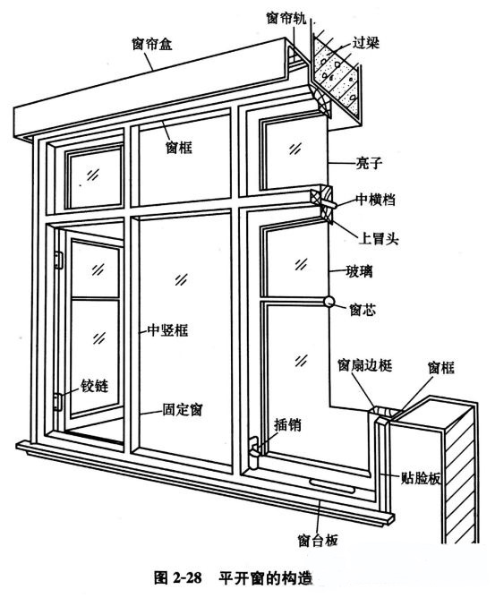 鋁合金門窗由鋁合金門窗框、鋁合金門窗扇和五金零件組成。鋁合金門窗框為為固定部分,由邊框、上框、下框、中橫框和中豎框構成;鋁合金門窗扇為活動部分,由上冒頭,下冒頭、邊梃、鋁合金門窗芯及玻璃構成;五金零件及附件包括鉸鏈、風鉤、插銷和鋁合金門窗簾盒、鋁合金門窗臺板、筒子板、貼臉板等。下圖是平開鋁合金門窗的構造組成。