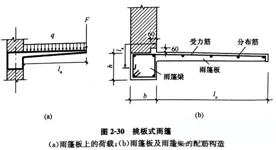 2、雨篷板。雨篷板為一典型懸臂受彎構件。雨篷板承受的荷載除有恒載(板自重、面層、抹灰等構造層重)、均布活荷載外,還應考慮施工荷載或檢修的集中荷載,見上圖(a)。